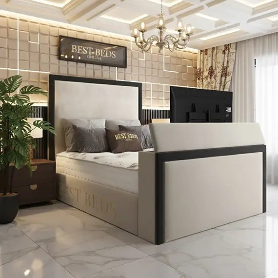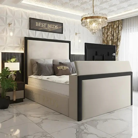 Introducing the Cream Upholstered TV Bed Frame – the perfect fusion of luxury, comfort, and cutting-edge technology. This stunning bed elevates your bedroom with its elegant cream upholstery while offering the convenience of a built-in TV compartment for a modern living experience. Whether you're indulging in a cozy movie night or simply unwinding in style, this bed offers a unique combination of comfort and functionality. Available in a variety of sizes, from Super King-Size to Single, it’s designed to suit every bedroom and meet your entertainment needs.