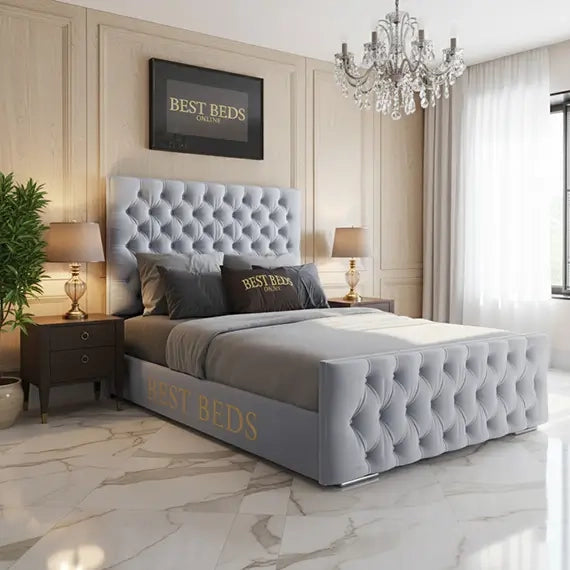 The Silver Upholstered Chesterfield Bed Frame is the epitome of luxury and style, designed to transform your bedroom into a grand and inviting space. With its high base, high headboard, and high footboard, this bed frame combines timeless Chesterfield design with modern sophistication. The beautiful silver upholstery gives it an elegant, reflective sheen that complements various interior styles, from classic to contemporary.
